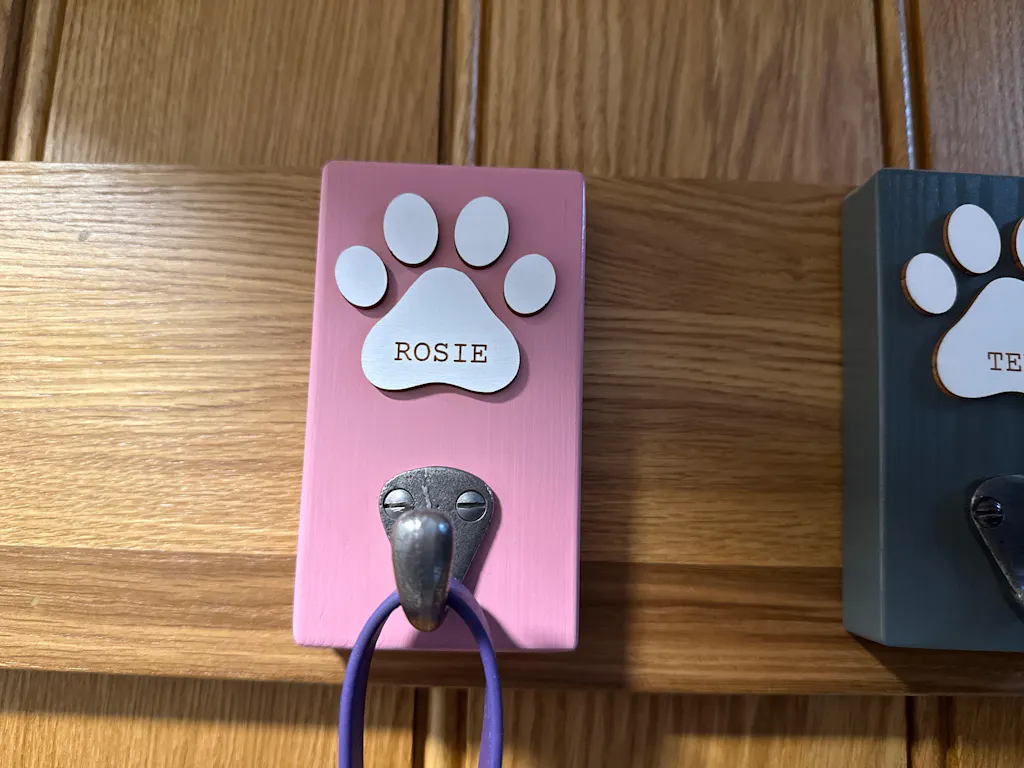 A stylish and personalised dog lead holder, handmade to order and engraved with your pup’s name. Keep your home organised in a playful yet practical way. The perfect gift for a proud dog mum or dad.